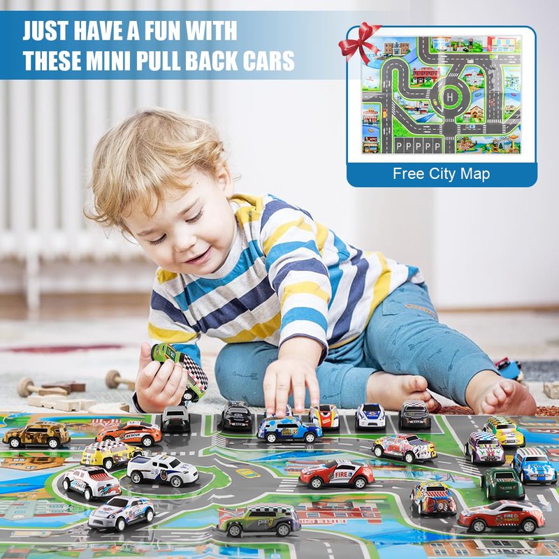 - [Great Birthday Gift Toy for Toddler] This pretend-play pull buck car vehicle set is great for kids to boost their vocabulary development and motor skills. Whatever your kid is going to be a doctor, a police, a fireman or he/she is interested in racing, this min pull back car is a good choice gift toy for your children 3-5 year old boys and girls.