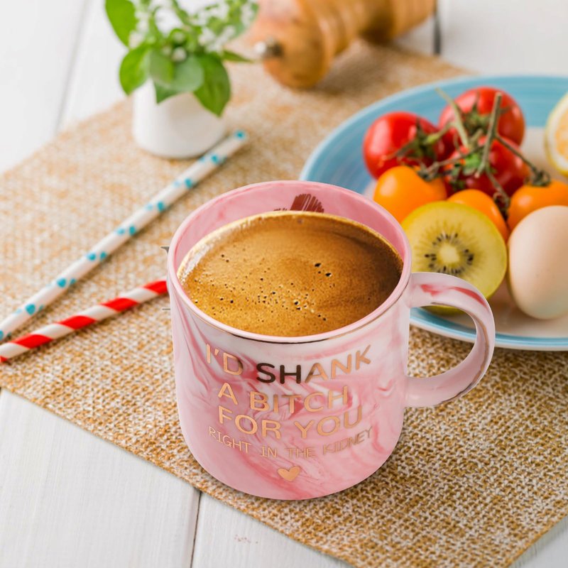 - đăElegant Hand Madeăthe mugâs pattern is unique, which symbolizes the unique love!lovely pink marble texture with reflective gold accents, and a gold heart on the inner lip. The gold and marble design is timeless and elegant!the ceramic is very resistant to high temperatures, long lasting, and lead-free design for your safety.Humanize C handle which is easy to hold, 12 Ounces (355 ml), large capacity fully contented the daily needs of various scenes.Dishwasher safe but microwave no safe.