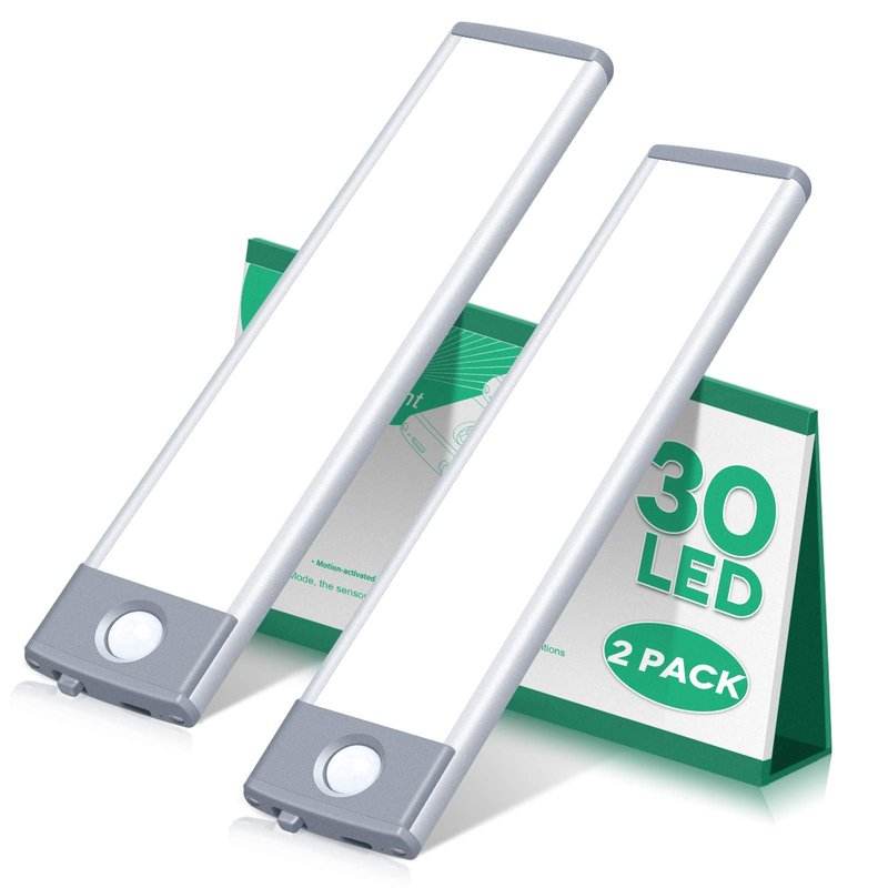 Motion Sensor Under Counter Lights 2 Pack Rechargeable, 30-LED Wireless Cabinet Lighting Magnetic Self-Adhesive, 180lm Ultra Thin Closet Light for Kitchen, Cupboard, Drawer, Stairs, Hallway, White
