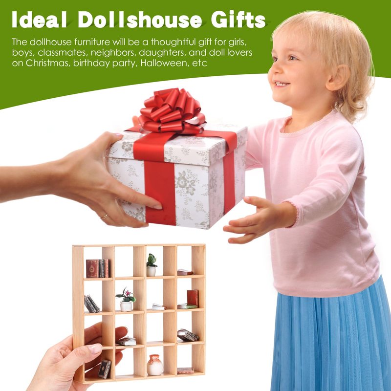 - Complete Dollhouse Accessory Set: the package includes 16 dollhouse miniature books, a miniature display shelf, a vase and 2 potted plants, providing a complete play and decoration solution to dolls house bookshelf needs while also doubling as a charming decoration