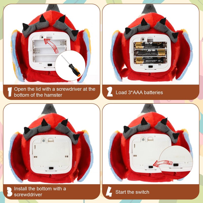 - Easy Operation: these mimicking parrot animal toys are designed with simplicity and convenience in mind; Install 3 AAA batteries (not included) by simply opening the battery compartment from the bottom, switch it on, and watch as it amusingly repeats your words, and swings its chubby little body creating a truly interactive experience