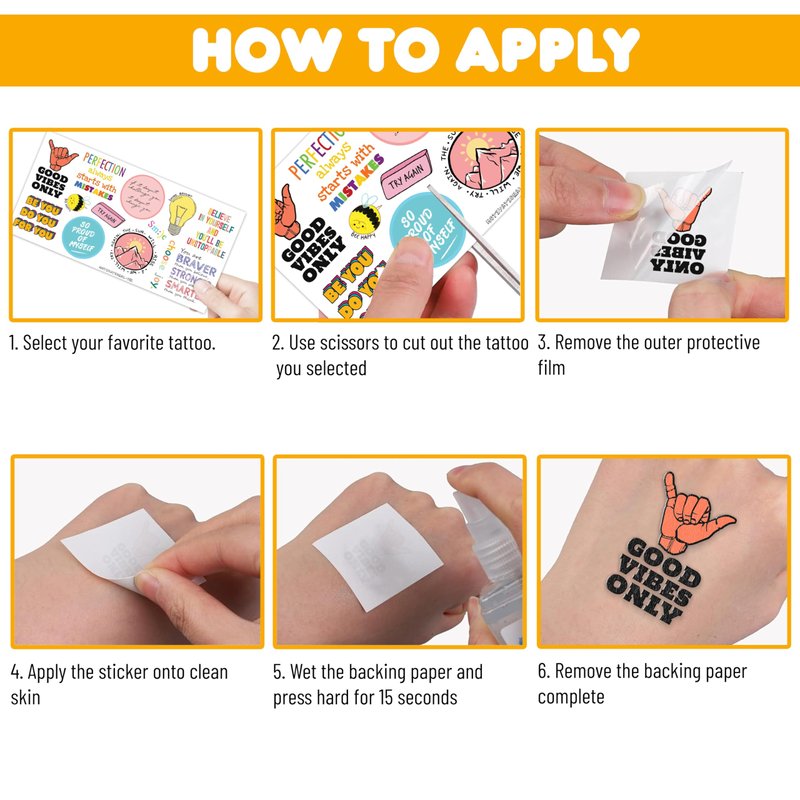 - đ´ăSIMPLE APPLICATION AND REMOVALă: Simply cut out each tattoo from the sheets and peel off the clear film. You can apply it to your hands, face, arms, or any area you feel comfortable. Additionally, you can place it on glasses, clothing, or a smooth flat surface. Afterward, thoroughly wet it with water and wait for 20-30 seconds before removing the backing paper. VoilĂ , you now have a smooth, velvety tattoo!