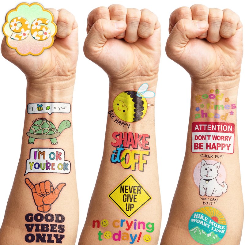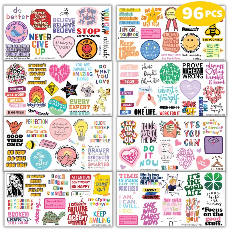 - đăIDEAL TATTOOS FOR THEMED MOTIVATION DECORă: This set of temporary MOTIVATION-themed tattoo stickers comprises 8 sheets in total, featuring a total of 96 PCS adorable, distinct designs. They are excellent for distributing as party favors and small gifts with a MOTIVATION theme for holidays. Each sheet measures 6.1 * 3.1 inches, making them suitable for kids of all sizes.