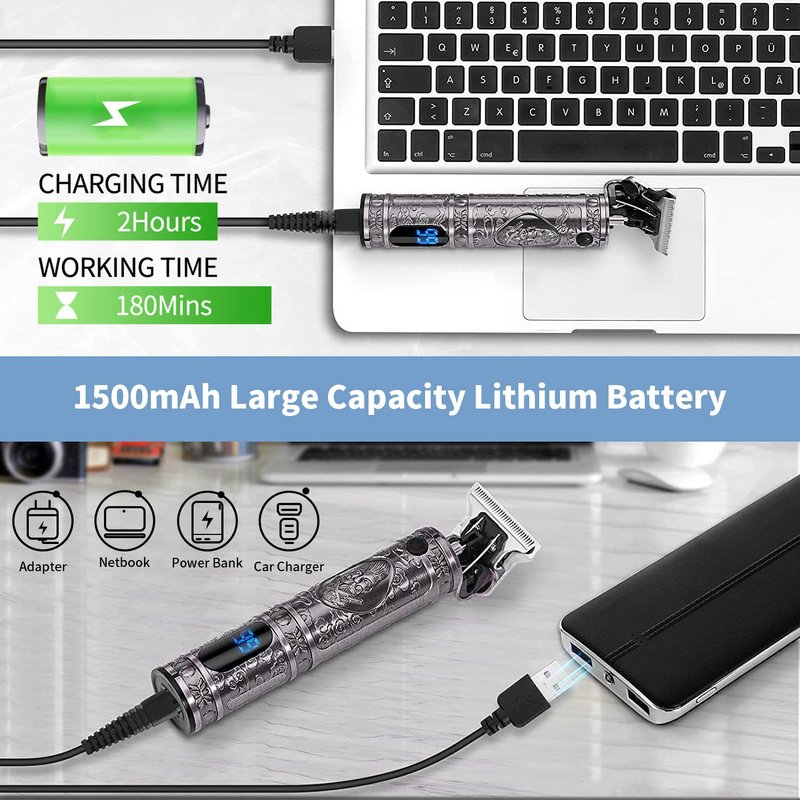 - 【LED Display & USB Quick Charging】: T outline mens clippers with smart LED display can display the percentage of electricity, so you can decide when to charge the hair trimmer after trimming. And can be used for 180 minutes after full charging2 hours. The hair trimmer can be used in both cord and cordless, you can connect any USB powered device, perfect for travel.