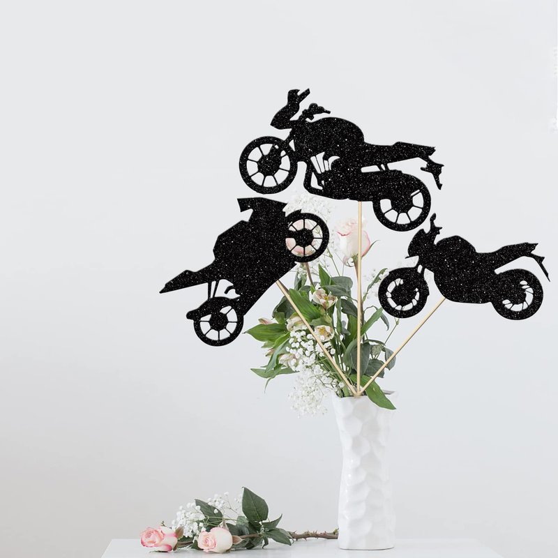 12 pcs Motorbike Happy Birthday centerpiece sticks.These centerpiece sticks is made of glitter paper and Bamboo stick.Need handmade DIY,simply attach glue dots to each prop and then to the stick.