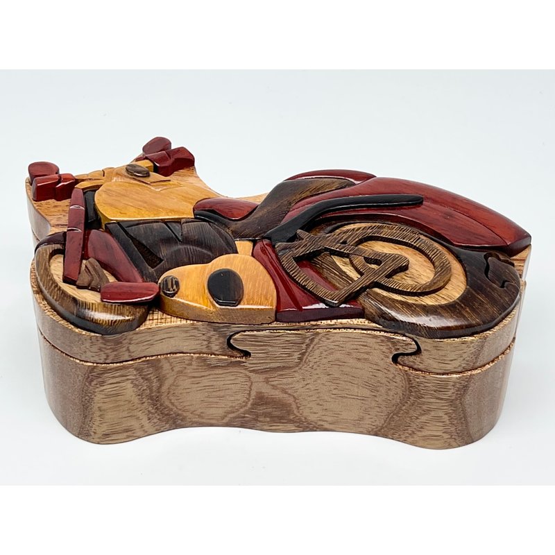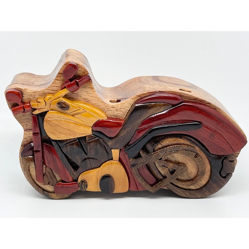Motorcycle Wooden Puzzle Box - Hand Carved Wood Trinket Box - All Natural Intarsia Wood Art