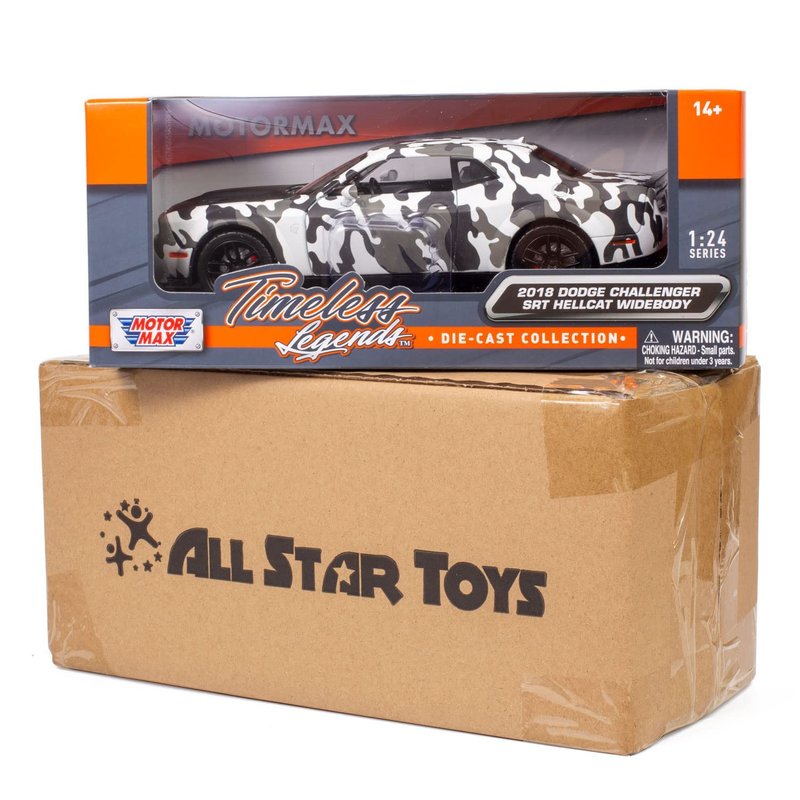 High-speed adventures for car-loving kids and adult collectors. Give collectors the ultimate thrill with this All Star Toys Exclusive Dodge Charger Diecast model for kids and adults. Based on the 2018 Dodge Charger SRT Hellcat Widebody, it’s packed with authentic details. Features openable doors and detailed interior. Best of all, it is finished with satin black hood and camouflage body that car enthusiasts love about. Item dimensions are approx. 7.5 x 3 x 2.75 inches. Comes in a window box and shipped in a corrugated mailer box for better protection.