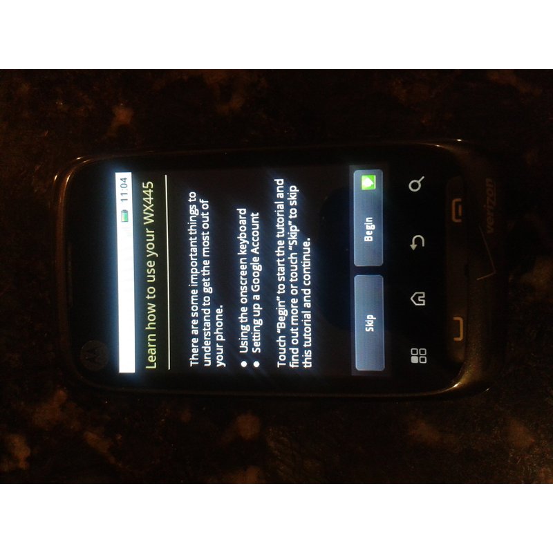 Motorola Citrus WX445 Android Smartphone for Verizon. This compact, affordable Android smartphone sports a unique trackpad for scrolling on the back, plus dedicated send/end keys on the front. Other key features include an eco-friendly shell, capacitive touch screen, full web browser, memory card slot, 3.5mm audio jack, EVDO 3G data, WiFi data, and 3-megapixel camera.. Includes:. Phone ; Battery ; Travel Charger ;Dimensions:. Weight: 3.88 oz (110 g); Size: 4.09 x 2.32 x 0.59 (104 x 59 x 15 mm) ;Specifications:. Modes: CDMA 850 / 1900; Form Bar: Internal Antenna; Display Type: LCD (Color TFT/TFD) Resolution: 240 x 320 pixels (QVGA) 3 diagonal; Platform Android version 2.1; Processor 528 MHz ; Memory 100 MB ;Features:. GPS / Location Type: A-GPS LBS, navigation; Multiple Languages Yes; Vibrate Yes; Bluetooth Supported Profiles: HSP, HFP, OPP, A2DP, AVRC, HID, PAN, MAP; USB Version: 2.0 High Speed micro-USB connector; Wi-Fi Version(s): 802.11 b,g; Multiple Numbers per Name Yes; Picture ID Yes; Ringer ID Yes; Voice Dialing Type: Speaker-independent (automatic); Custom Graphics Yes; Custom Ringtones Yes; Real-Music Ringers Supported Formats: AAC, AAC+, eAAC, eAAC+, MP3, OGG; Flight Mode Yes; High-Speed Data Technology: 1xEV-DO r0; WAP / Web Browser Browser Software: Android browser (WebKit-based); Side Keys volume, camera on right; Touch Screen Type: Capacitive multi-touch; Memory Card Slot Card Type: microSD (TransFlash) 2 GB card included / supports up to 32 GB; Email Client Protocols Supported: IMAP, POP, SMTP, Exchange OWA, GMail; Instant Messaging Networks Supported: Google Talk; MMS Yes; Text Messaging (SMS) View Style: Threaded; Headphone Jack (3.5mm) Yes; Music Player Supported Formats: MP3, AAC, AAC+, eAAC+, OGG, WMA, WAV, AMR-NB/WB supports DRM; Camera Resolution: 3+ megapixefixed-focus, geo-tagging; Streaming Vid