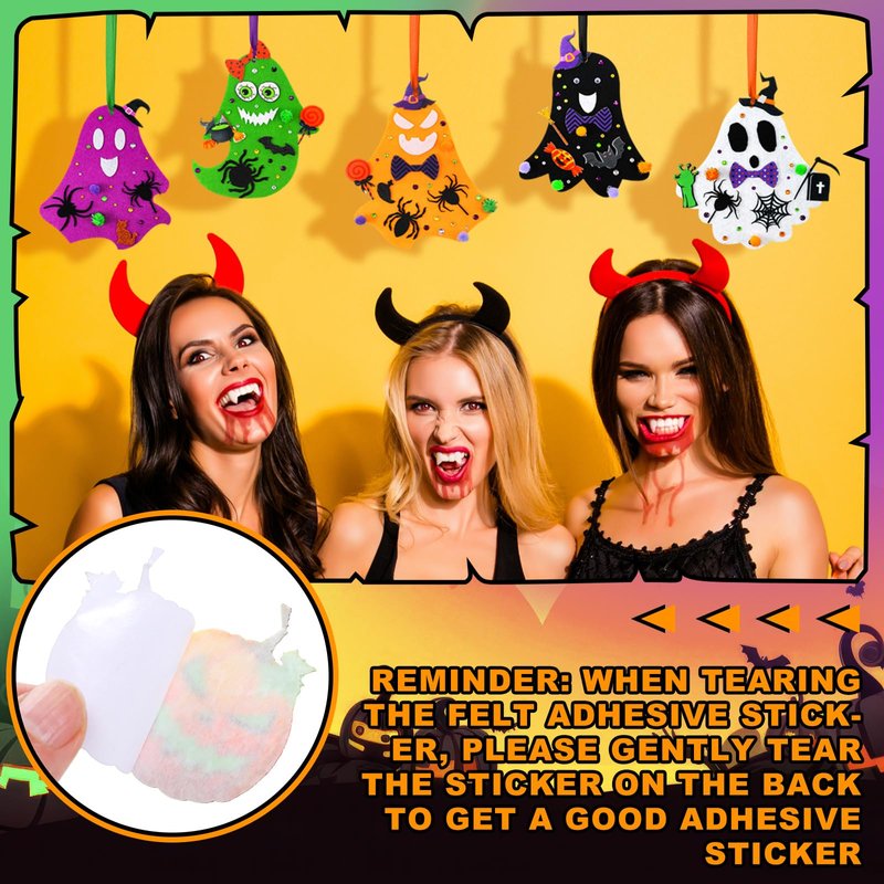 - How to Use: offering a creative Halloween set, you can easily attach it to the ghost felt pendant simply by gently tearing the film on the back of the felt or foam sticker (the paper behind felt back adhesive sticker is very thin, can be gently torn, excessive force will tear the product), remove each diamond from the diamond sticker; The bubble ball can not be installed directly, the eyes are also with glue, tear the sticker behind