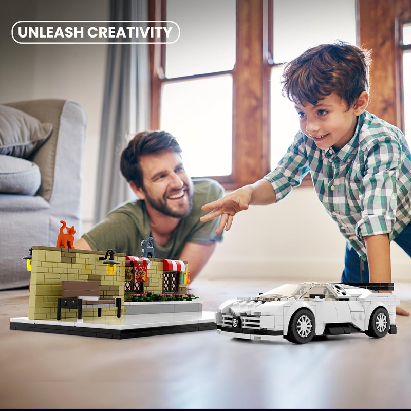 - 【Perfect Match】 The perfect combination of street scenes and supercars, Recreates the intricate details of a street-side café and supercar, including brick walls, benches, cats, etc., creating an authentic street atmosphere, Also designed cool simulation cockpit for minifigures