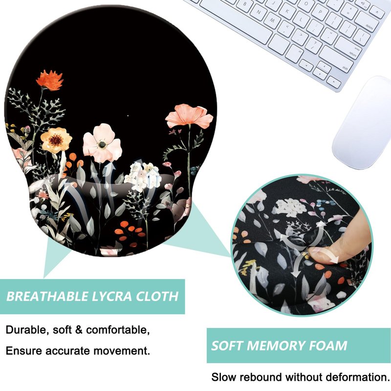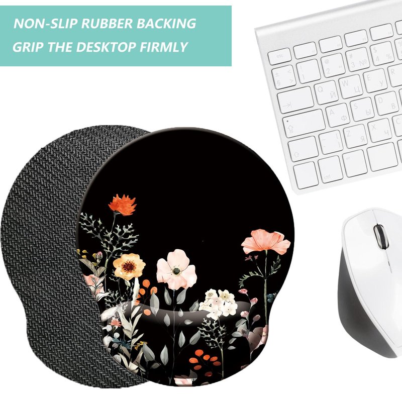 Mouse Pad with Wrist Support, Ergonomic Mouse Pad with Memory Foam Wrist Rest Cushion, Non-Slip Rubber Base Gaming Mice Pad for Home Office Computer Laptop, Flower Black