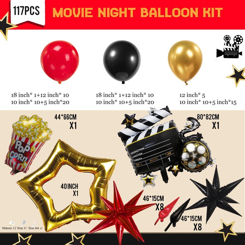 • 【Movie Themed Balloon Kit】 includes the following 119PCS different sizes of 5 inch, 10 inch, 12 inch and 18 inch balloons. We chose red and black gold as the theme palette and added mylar 40 inch pentagram, 32 inch movie camera Clapperboard , 26 inch starburst, 24 inch popcorn and 18 inch star balloons with glue dot chain set, allowing you to replace the atmosphere of the protagonist, which is a perfect complement for birthday and anniversary movie themes
