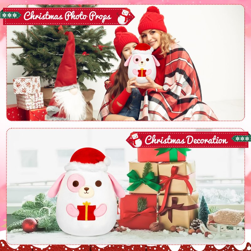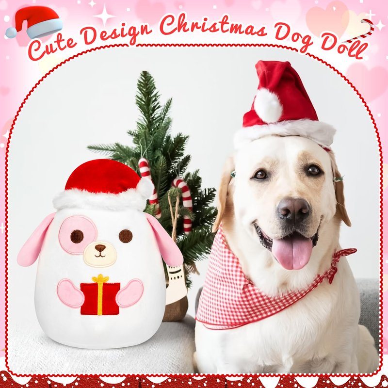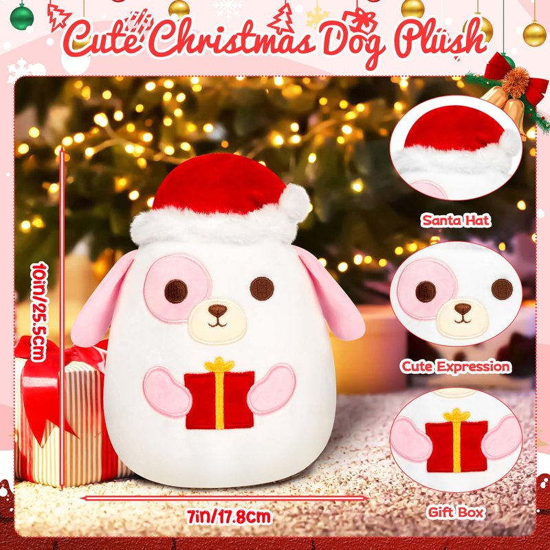 • CUTE CHRISTMAS DESIGN: 10 inches Christmas dog plush toy with a Santa hat on his head and a red gift box in his hand, is he playing Santa Claus? A cute puppy for Christmas again, full of Christmas holiday spirit
