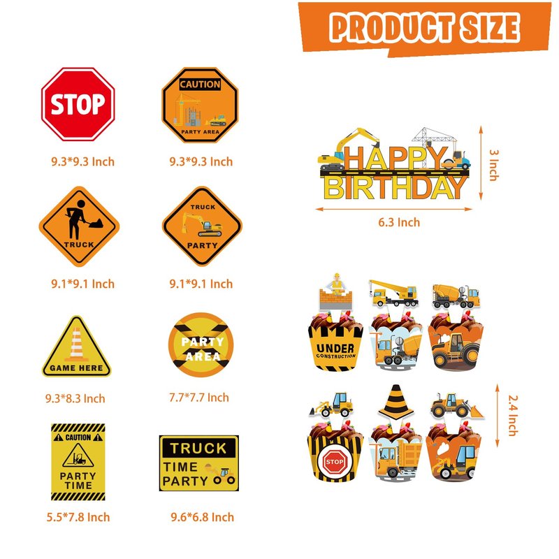 - WHAT CAN YOU GET IN PARTY: Our construction birthday party supplies include 1 Backdrop, 24 Cupcake Topper, 24 Cupcakes Wrappers, 70 Pcs Latex Balloons (4 Styles), 2 Foil Balloons, 2 Tablecloths, 8 Party Traffic Signs, 1 Construction themed Banner, 1 Cake Toppers.