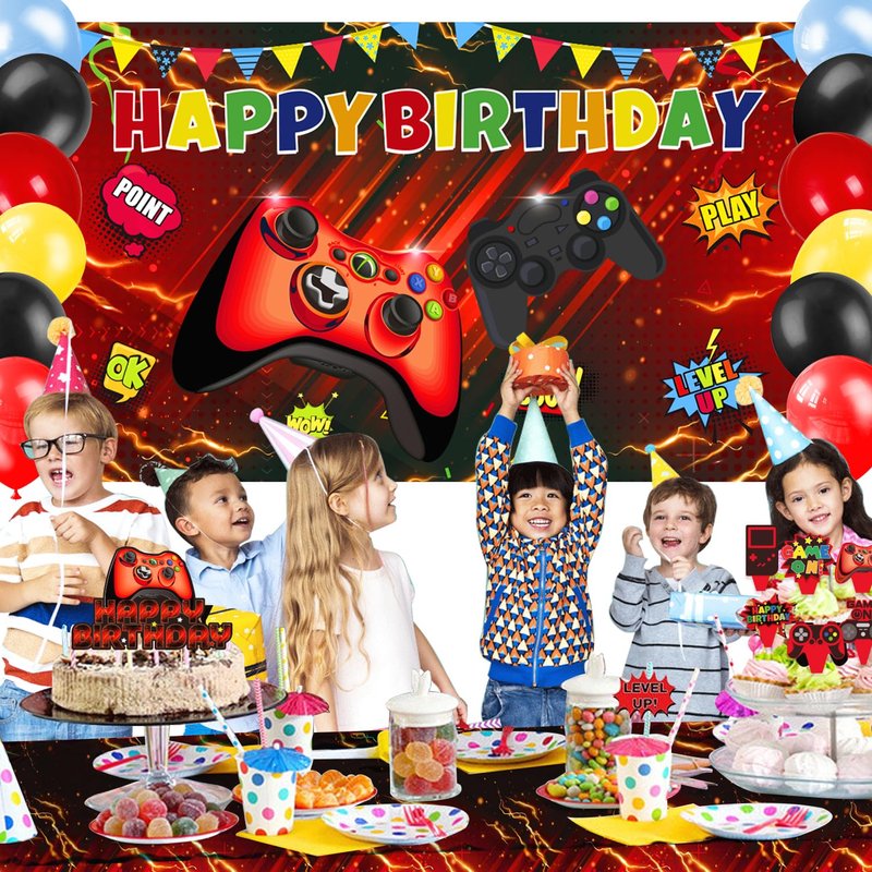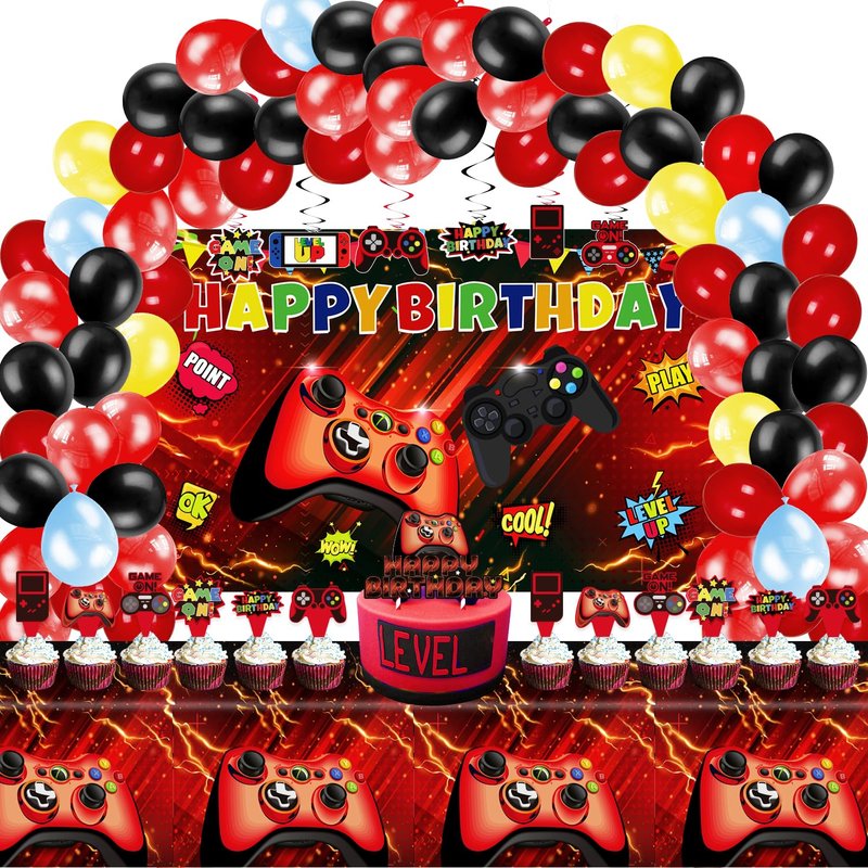 - WHAT CAN YOU GET IN PARTY: Our game party decorations include 1 Happy Birthday Gaming Backdrop, 70 12-inch Latex Balloons (4 Styles), 2 Foil Gaming Balloons,1 Big Cake topper, 24 Cupcake toppers, 6 Hanging Swirls, and 2 Tablecloth.