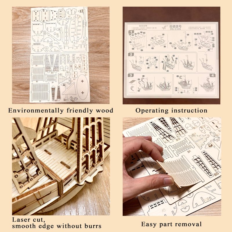 - Material: Eco-friendly wood. Laser cutting technology make parts easily removed from the board and edge smooth without burrs. Clear part numbers and operating instructions make this item easy to complete.