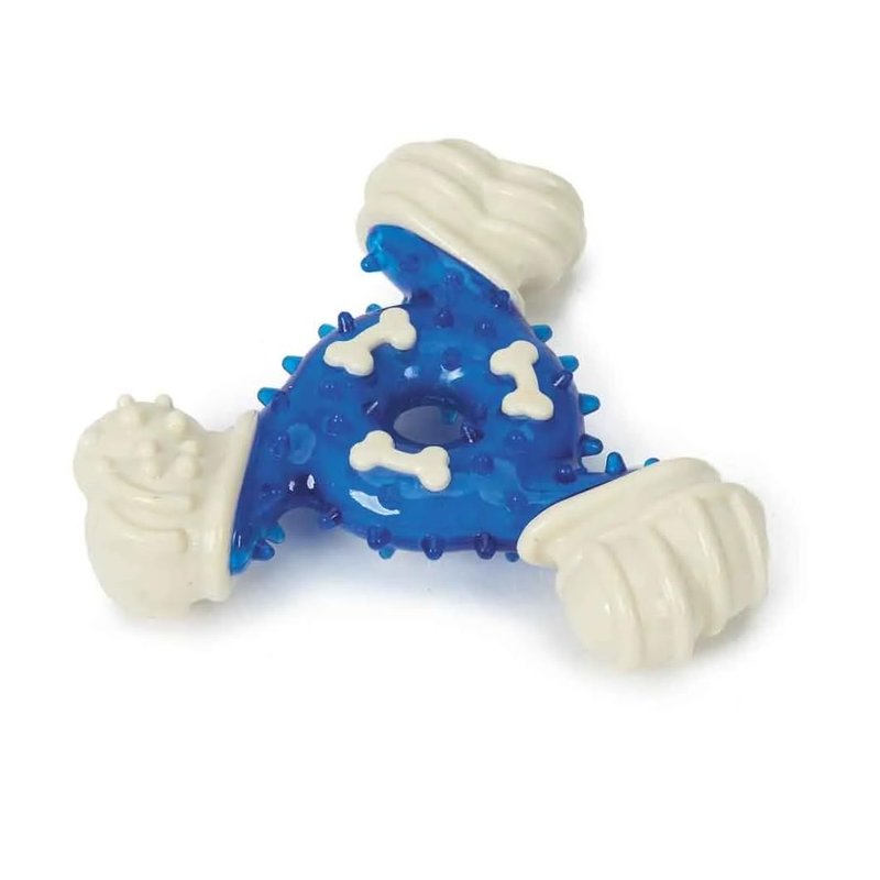 Mighty Triangle Tough Dog Toy Perfect for the tough chewer. Massages gums and cleans teeth. Made of durable hard rubber, unique three ended shape creates exciting and unexpected bounces further exciting dogs. Nubby texture massages gums and cleans teeth. Satisfies dogs natural instinct to chew. Helps keep pets active and eliminates boredom. Each toy measures 4 1/2 inches. Available in blue, green, pink, one toy of sellers choice, or a full set of all 3 colors!