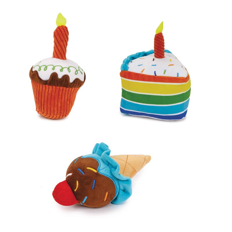 Dog Sweet Treat Plush Toys Our sweet treat plush toys are soft plush multi sensory toys that feature fun colors and enticing textures! Our birthday cake, cupcake, or ice cream cone are all perfect for your pups birthday celebrations. All 3 toys feature a squeaker to excite and entice pets to play. Perfect for fetching, tossing, or snuggling! Helps relive boredom. Birthday cake: 6" Cupcake: 6" Ice Cream Cone: 5" Available in birthday cake, cupcake, ice cream cone, or full set of all 3 toys!