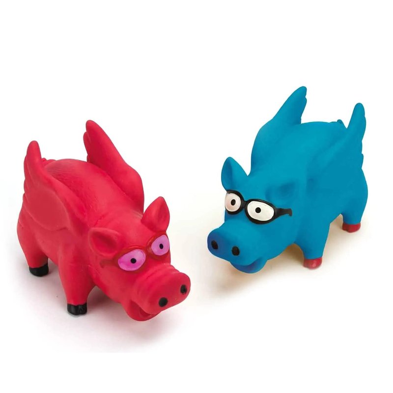 Flying Grunting Pig Latex Dog Toys Fun grunting sound excites your dogs! Latex body is durable and perfect for dogs of all ages. Easy to clean latex is ready for hours of playtime. Satisfies dogs natural instinct to chew Helps keep pets active and eliminates boredom! Not for aggressive chewers! Available in Pink, Blue, or Set of 2 both colors!