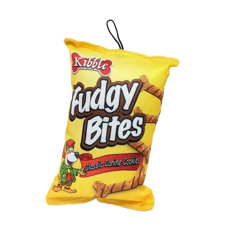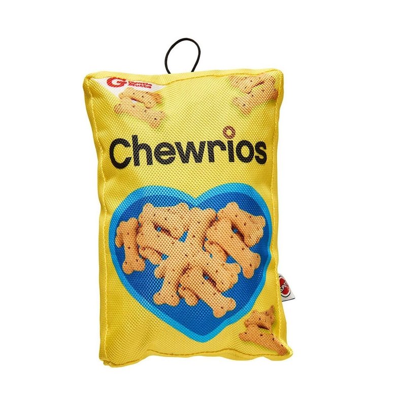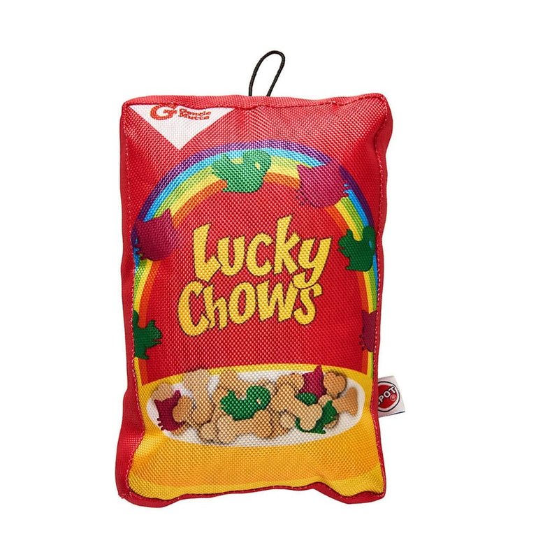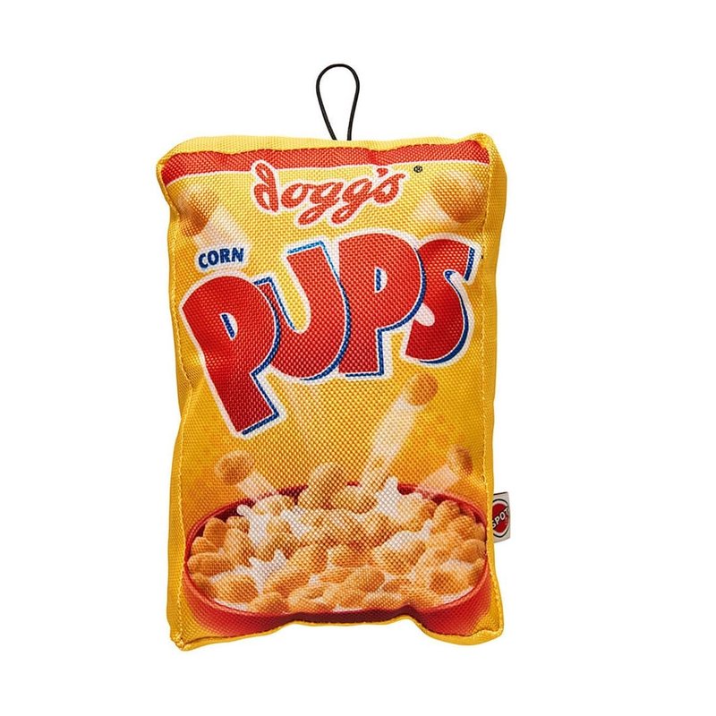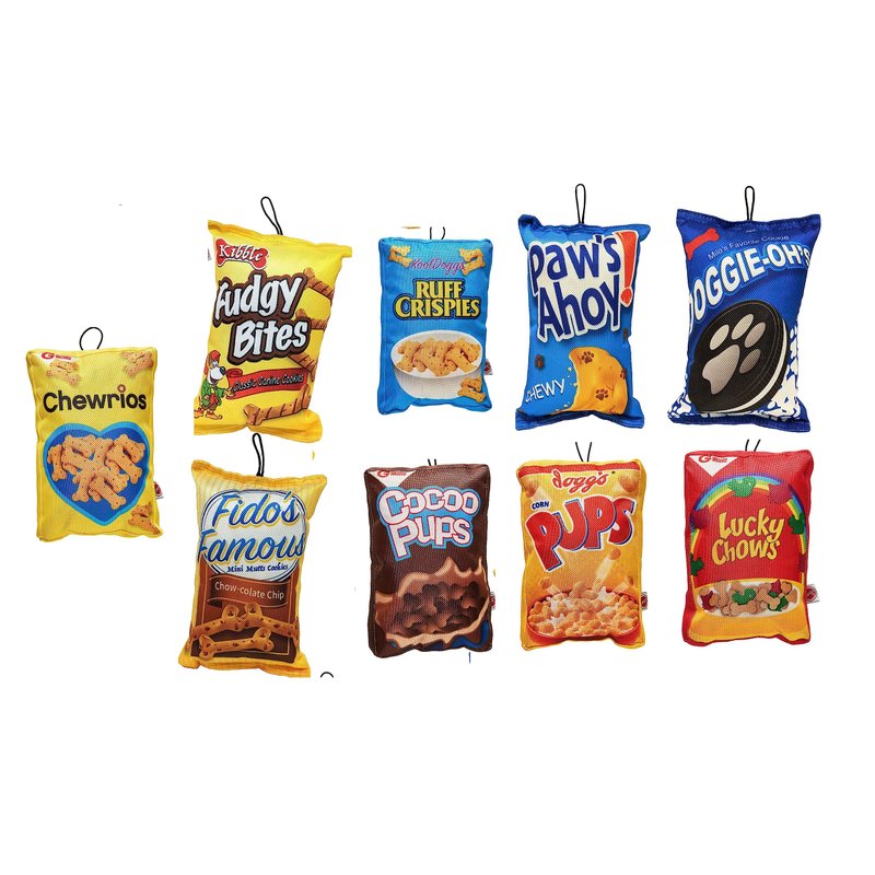 Fun Food Dog Plush Toy For 100% fun with zero calories try our pet fun food squeak dog toy! These pawsome parody toys look just like your favorite cookies or cereal! The realistic design is printed on a durable ballistic nylon, with crinkle paper inside to make packaging sound that dogs adore. Internal squeaker helps capture your pups attention. One things fur sure your pal can't wait to crunch on this snacktastic toy! Available in your favorite snacks, Chewrios, Cocoo Pups, Doggie Ohs, Dogs Pups, Fidos Famous, Fudgy Bites, Lucky Charms, Paws Ahoy, or Ruff Crispies! Also available in a full set of All 9 Toys!