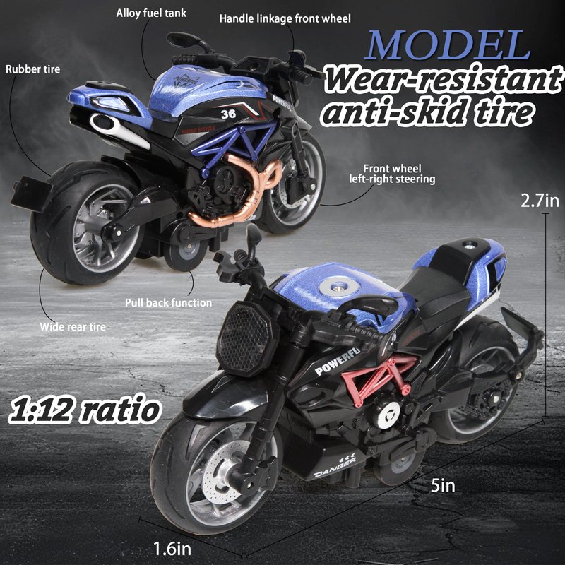 - PULL BACK MOTORCYCLE TOYS: Our die-cast cars are made of high quality alloy and abs material, safe and non-toxic, sturdy and durable, wear and tear resistant, drop resistant