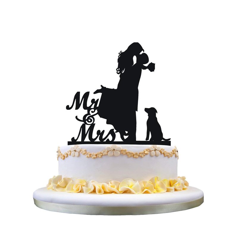 Mr & Mrs Bride and Groom Cake Topper with Dog Pet Silhouette funny wedding cake topper