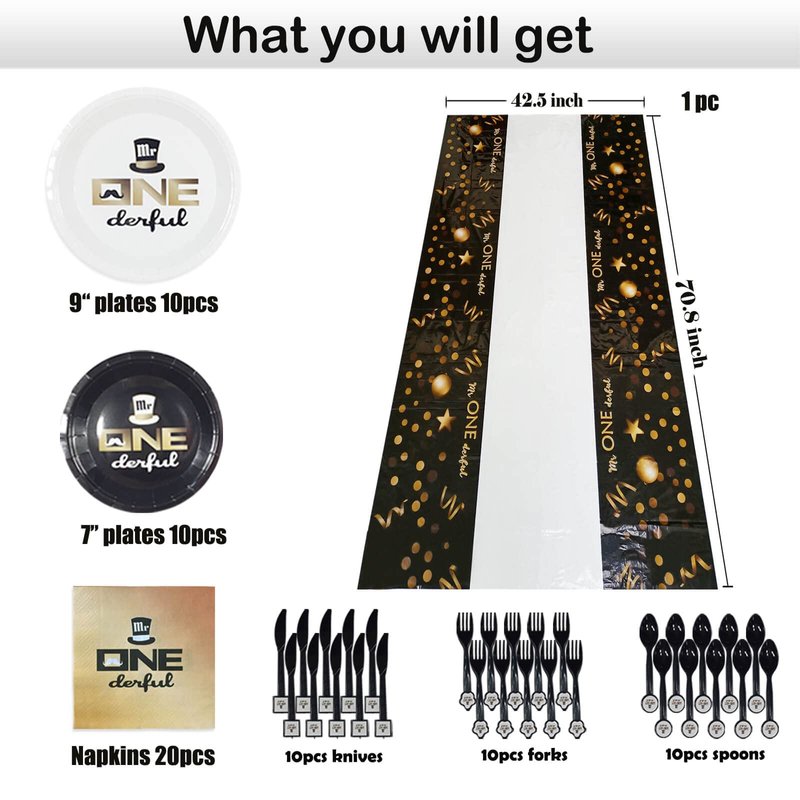 - Size & Package: Includes 1 pc Mr onederful theme disposable rectangle table cover 42.5"x70.8", 20 pcs plates ( 9" 10pcs & 7" 10pcs), 20 pcs napkins. All these can add more birthday atmosphere for your party