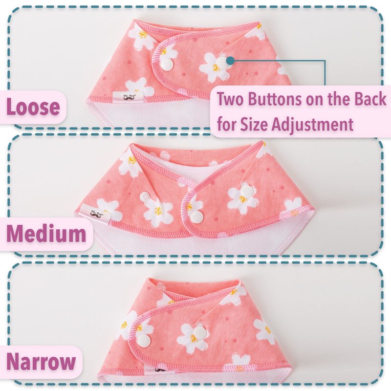 - Each baby bib is designed with 2 nickel-free snaps that allow each bib to be adjustable in size to fit newborns and toddlers aged 3-24 months. The snaps are secure, making it difficult for infants and toddlers to unfasten, but they are easy for parents to snap on and off.
