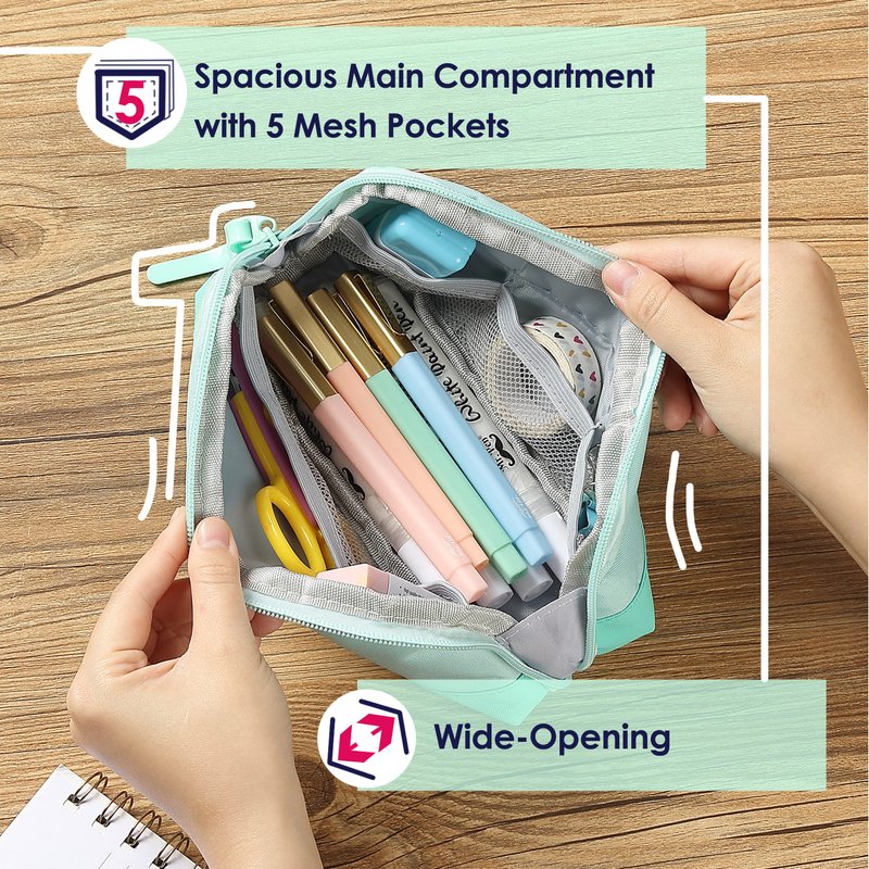 • This pencil pouch features a spacious main compartment lined with 5 mesh pockets of various sizes to store everything from pens and pencils to rulers and scissors. The case also has a zippered closure to keep everything secure.