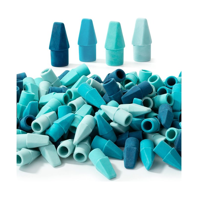 - Package includes 120 pencil top erasers in 4 different blue shades. They can also be the protective cap for pens or pencils, prevent tips from breaking, and make clean corrections to office documents and homework.
