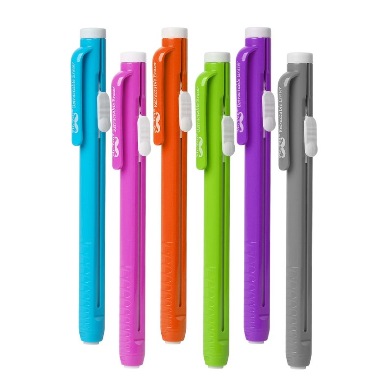 Mr. Pen retractable pencil erasers are great for homes, offices and schools. The set comes with 6 retractable erasers in assorted color: Purple, blue, green, gray, pink and orange. High quality erasers, erase pencil marks without tearing paper or smudging.