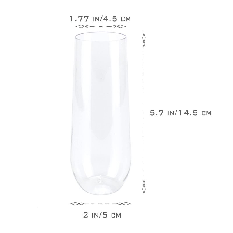 Product features 12pc 9 oz. Color: transparent Durable and strong Disposable champagne flute can be used once, used for quick cleaning afterwards, and can also be reused Perfect for banquets, weddings, bars, nightclubs, leisure and social gatherings Wedding, engagement and bachelor party, exquisite modeling of new year's Eve Practical structure for convenient beverage consumption without overflow The plastic champagne flutes is suitable for cocktails, champagne, wine, Mimosa, Bloody Mary, soda, etc Good dessert introduction - frozen cake, sundae and ice cream High quality flute Elegance and practicality coexist! Make sure that at your next party, these mimosa bar supplies not only look amazing, but also perform better. With its shiny appearance and thin shape, even the most complex party can exude the greatest elegance. Round edges and wide mouth ensure that your sipping experience is amazing and spill free. The plastic mimosa glasses for parties are disposable and can be used for cleaning! After every party, make sure you don't have to go everywhere to clean or damage your precious wine. However, because of their excellent quality, the champagne flutes disposable are easy to reuse, so you can choose how to use your cup!