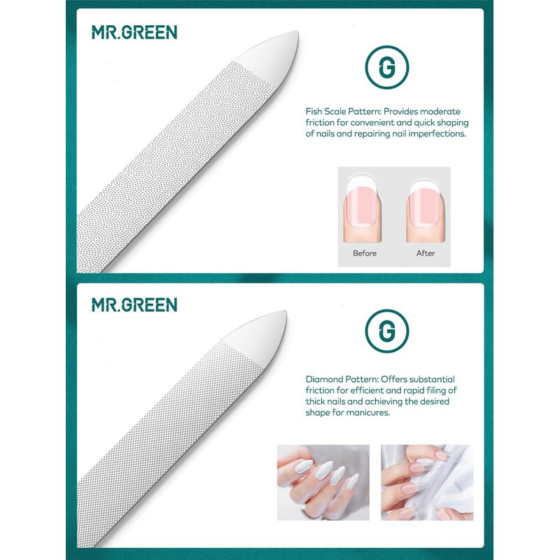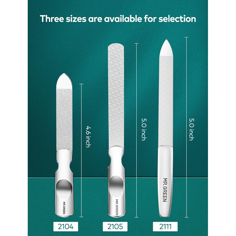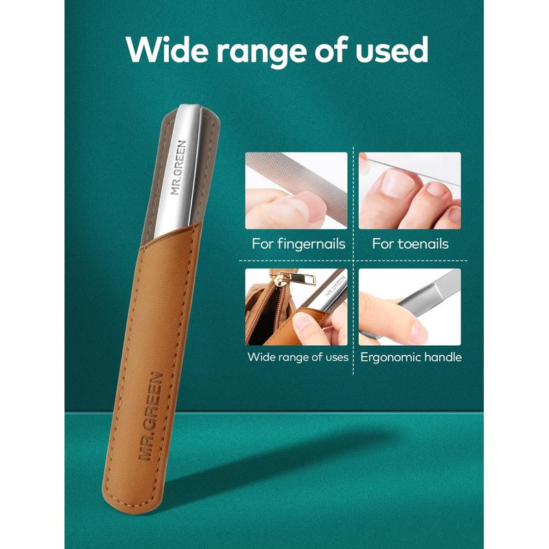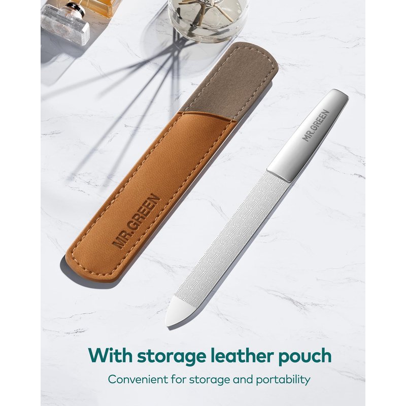 MR.GREEN Nail File,Professional Double Sided Stainless Steel Nail File with Non-Slip Handle and Leather Case,Pointed Nail Buffering Files Washable, Metal Nail File for Men and Women