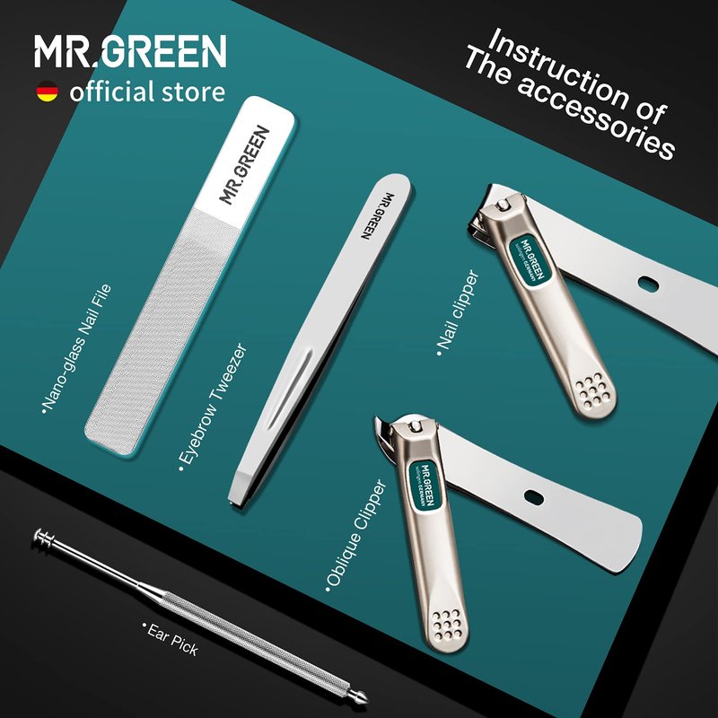 - There are five accessories in this series:Nail Clipper,Ear Pick,Oblique Clipper,Nano-glass Nail File,Eyebrow Tweezer,four kinds of accessory combinations can be selected.