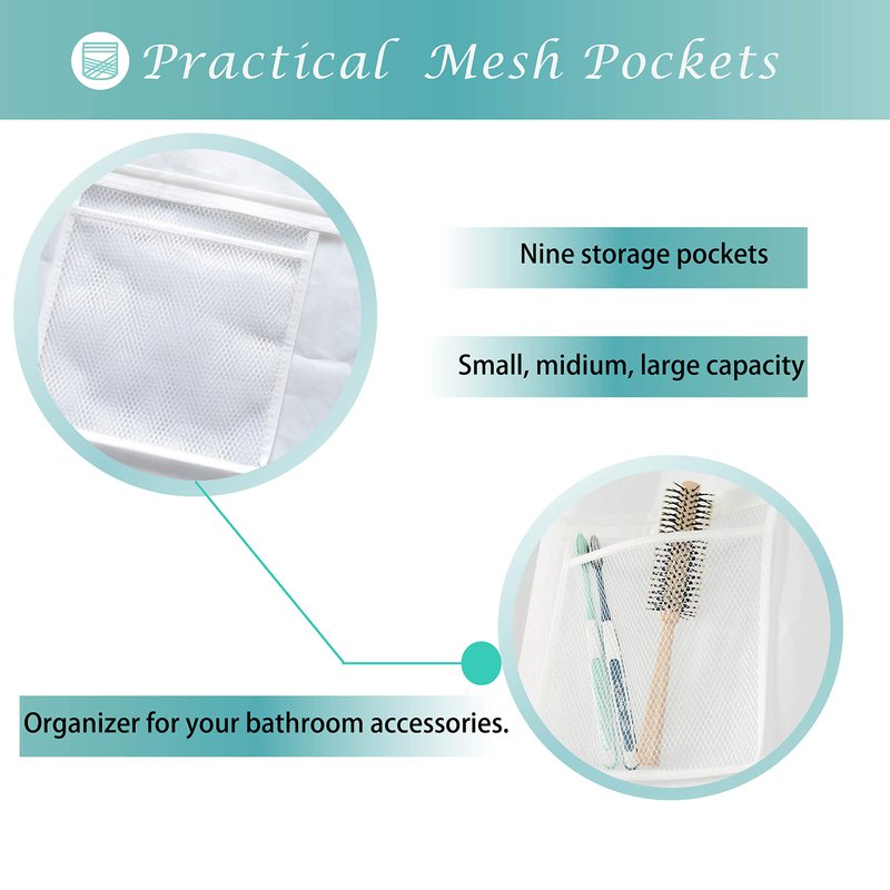 - Nine handy mesh pockets could be used for tidying and maximize storing your bath accessories