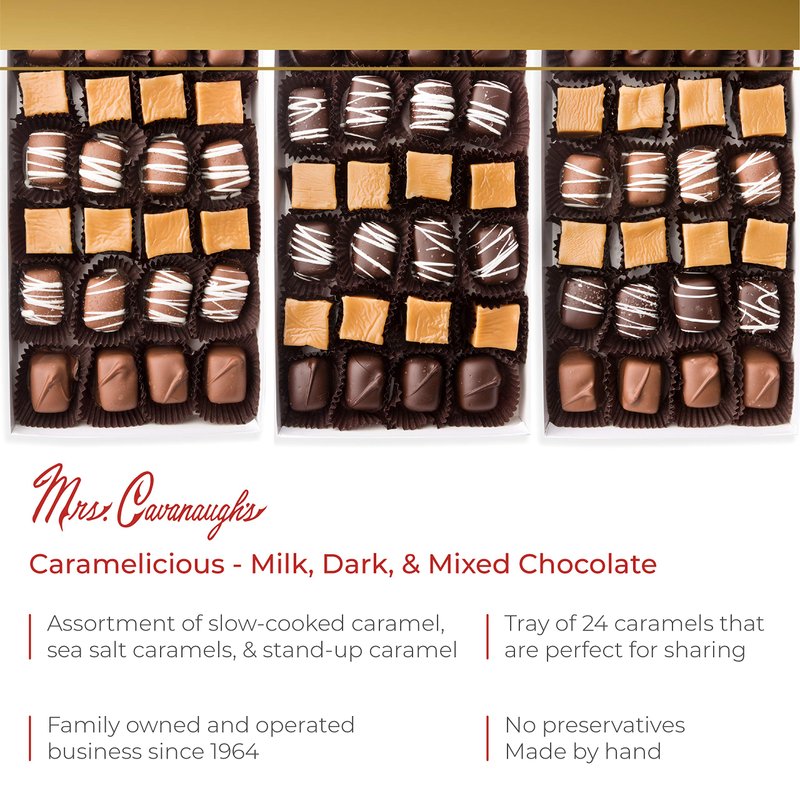 - CARMELICIOUS SAMPLER: Caramel, caramel, and more caramel! This selection contains our slow-cooked caramel, sea salt caramels, and stand-up caramel. These treats are made from a perfect blend of caramel and our smooth chocolate! Mrs. Cavanaugh's Famous Caramelicious 1 lb box contains approx. 24 pieces and is available in milk chocolate, dark chocolate, or both in various sizes.