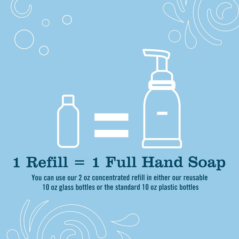 - Mrs. Meyer's Clean Day 2 oz Concentrated Refill is equal to 1 full Foaming Hand Soap using our 10 oz reusable glass or plastic bottles