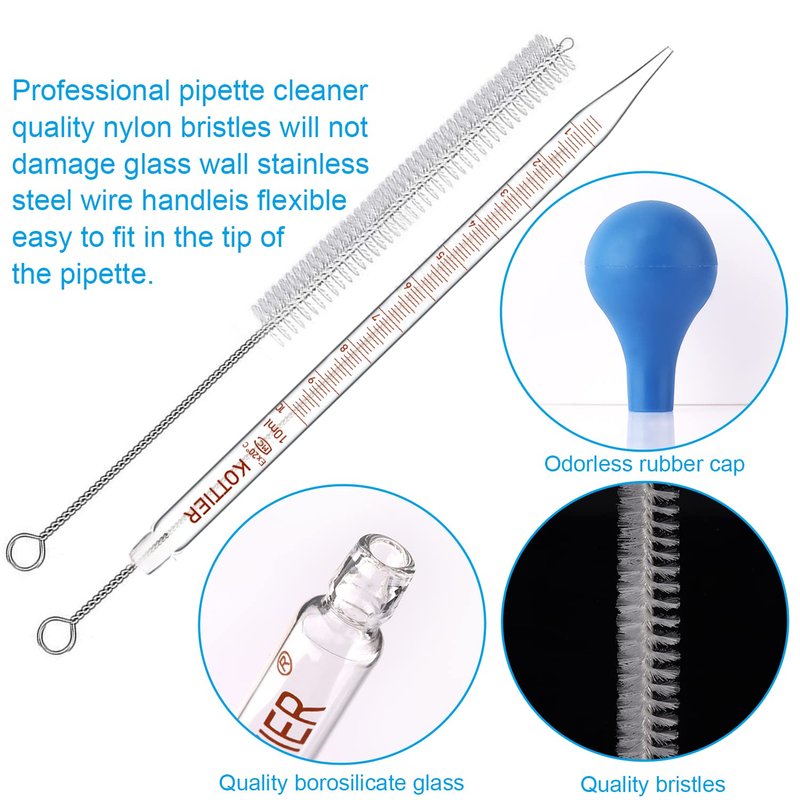 - Glass Pipette Kit: You will get 3 10ml Lab Graduated Droppers + 3 large rubber caps, and includes a conical bottle brush to fit narrow bottoms for cleaning, pipettes fit your every need