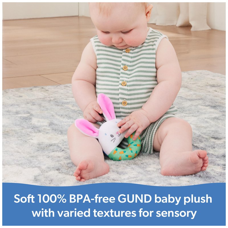 - TACTILE STIMULATION: Soft, 100% BPA-free GUND baby plush with varied textures for sensory enhancement. Ideally sized, circular design for small hands, and “chewable” ears for teething relief
