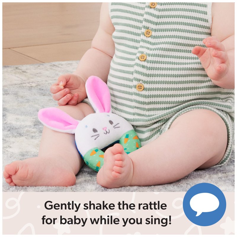 - COMMUNICATION SKILLS: Sing "Hop little bunnies, hop, hop, hop" while moving the rattle to the beat. This helps babies link cause and effect and enhance communication