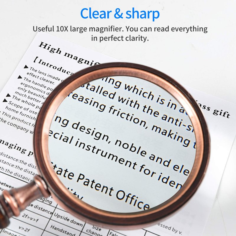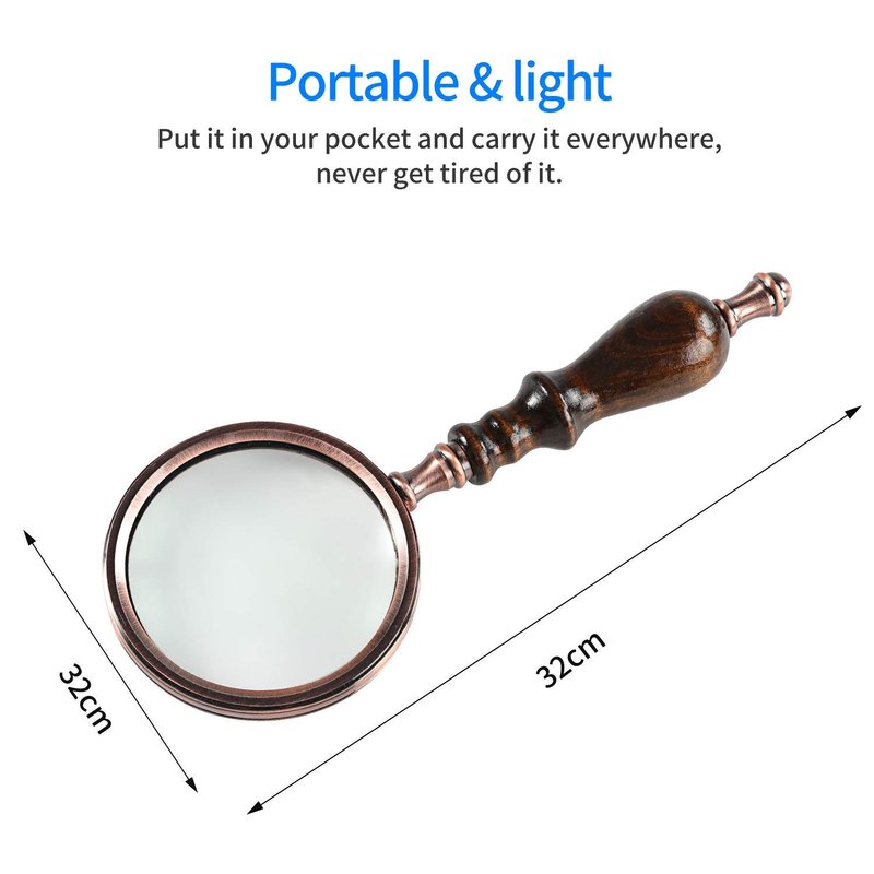 - Premium Design --- This magnifying lens comes with a sandalwood handle and copper frame, which feels like a coherent entity. The antique design sending out slight retro taste always make you be pleasure with it.