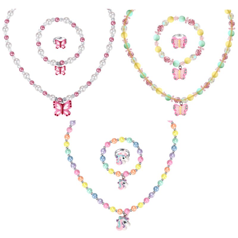3 Sets Girl Princess Necklace Bracelet Ring Kids Stretchy Jewelry Gift Unicorn Butterfly Necklace Bracelets Rings Party Favors Dress up Jewelry for Little Girl Toddler(with Gift Box)