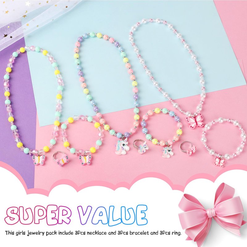 - Package included- Those girl jewelry includes 3 sets bracelet and necklaces rings with different styles and colors, they come in a pretty unicorn gift box. A surprise gift for your little angel!!