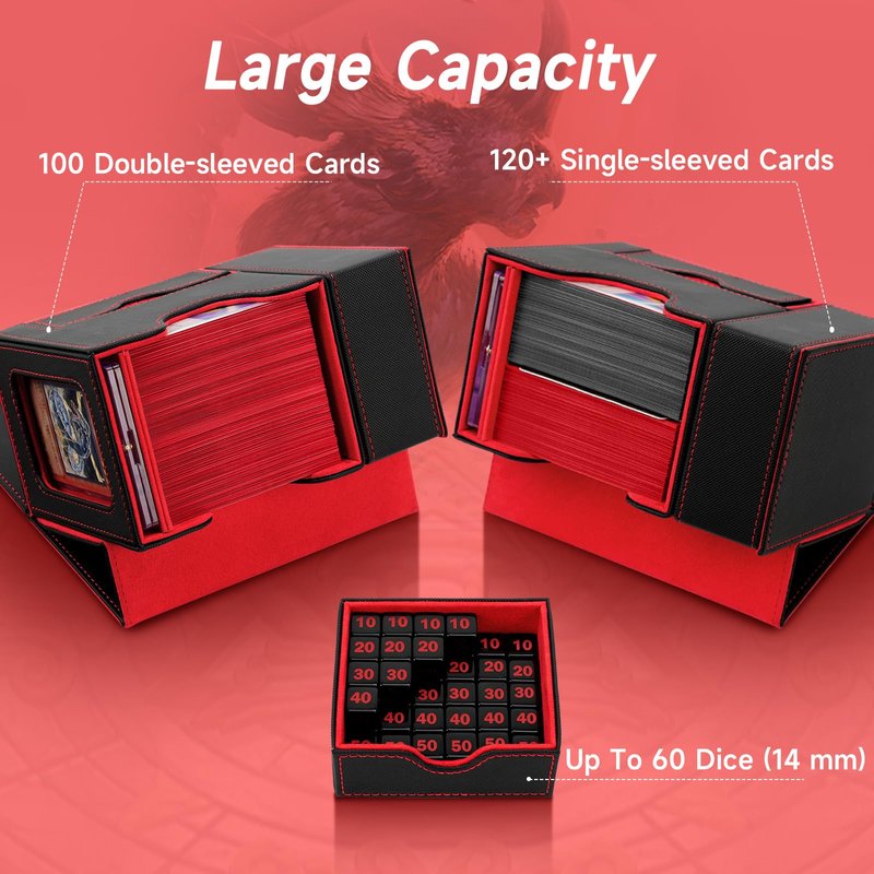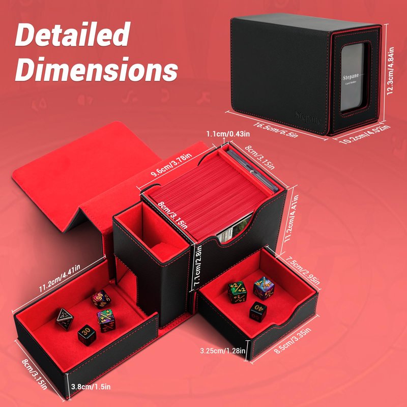 - Large Capacity: The Stepane MTG deck box has been tested with a variety of popular sleeves on the market and can hold up to 100 double-sleeved cards or 120 single-sleeved cards; the dice tray holds up to 60 dice (14mm); ensuring that all gaming essentials are neatly organized and within easy reach