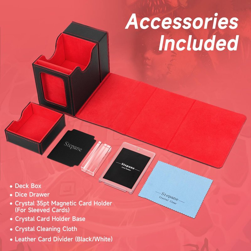 - Commander's Final Destination: Stepane MTG deck box is specially designed for commander EDH players; the crystal 35pt magnetic card holder can protect your commander well; the unique dedicated slot makes him visible through the side window even when he is placed in the commander deck box; when he is taken out, you can match the card holder base and let your commander proudly Stand proudly on the battlefield