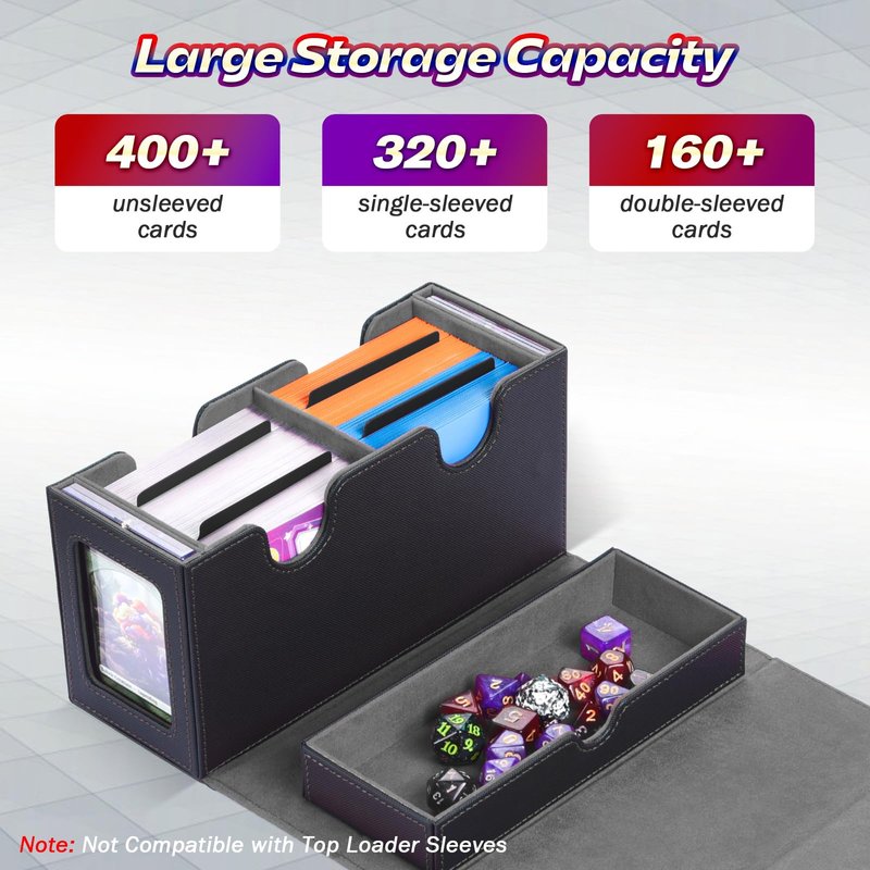 - 【Perfect for On-the-Go Gaming】Boasting a generous capacity that fits over 400 unsleeved cards, over 320 single-sleeved cards, or up to 200 double-sleeved cards, this compact yet lightweight card deck box is a breeze to tote around. Perfect for tournament adventures or friendly gaming sessions with friends. PLEASE NOTE, IT'S NOT COMPATIBLE WITH TOP LOADER SLEEVES.