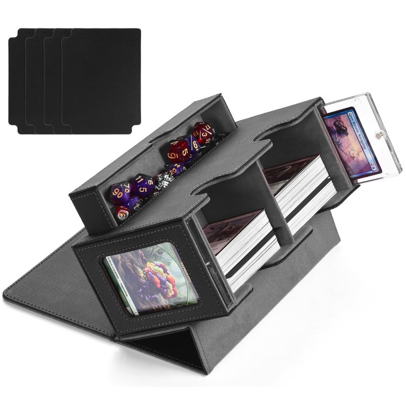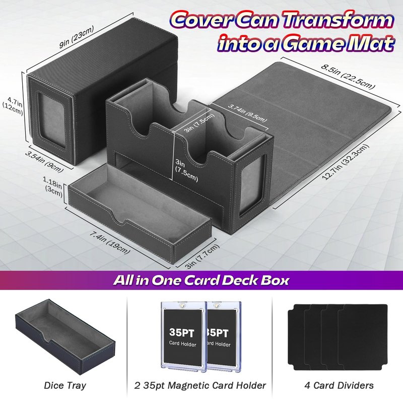 - 【Expertly Crafted Design】 The wide U-shaped opening and smart flip-cover simplify card access and return, ensuring a seamless gaming experience. Plus, the tcg deck box cover transforms into a handy stand or even a game mat. And with the built-in dice tray, your dice stay organized and ready for action, right where you need them.