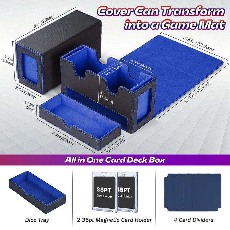 - 【Expertly Crafted Design】 The wide U-shaped opening and smart flip-cover simplify card access and return, ensuring a seamless gaming experience. Plus, the tcg deck box cover transforms into a handy stand or even a game mat. And with the built-in dice tray, your dice stay organized and ready for action, right where you need them.