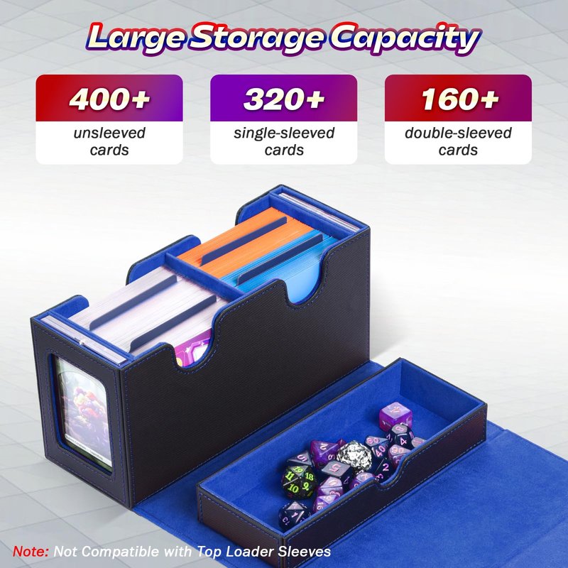 - 【Perfect for On-the-Go Gaming】Boasting a generous capacity that fits over 400 unsleeved cards, over 320 single-sleeved cards, or up to 200 double-sleeved cards, this compact yet lightweight card deck box is a breeze to tote around. Perfect for tournament adventures or friendly gaming sessions with friends. PLEASE NOTE, IT'S NOT COMPATIBLE WITH TOP LOADER SLEEVES.
