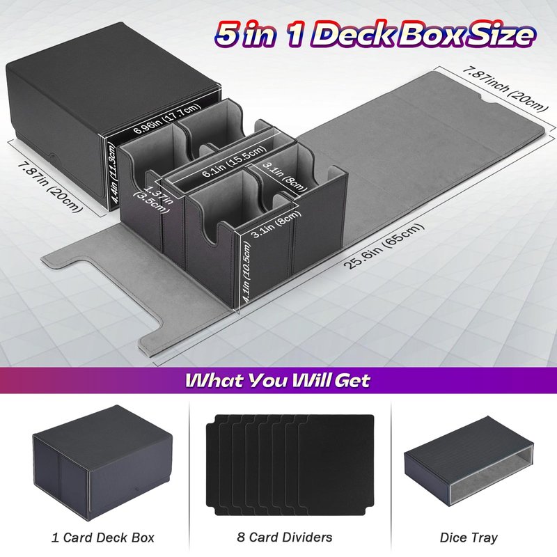 MTG Deck Box with Dice Tray, 5 in 1 Commander Deck Box Fits 840+ Sleeveless Cards, Leather Magnetic Deck Box MTG, Detachable Deck Box TCG CCG YuGiOh, Trading Card Deck Box with 8 Dividers (Black&Gray)